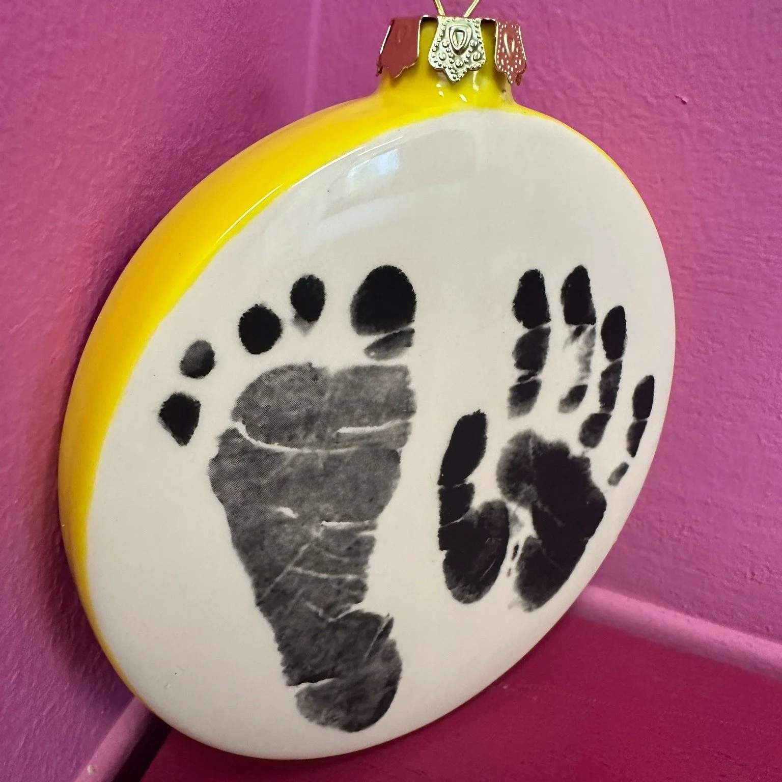 Our custom hand-painted ornaments are the perfect gift for a loved one. Purchase the ornament here, and we will send them a link to customize it. If they have a Mamie's Poppy Plate, we have the hand/footprints. We also have custom stamps available if needed (instead of a print).